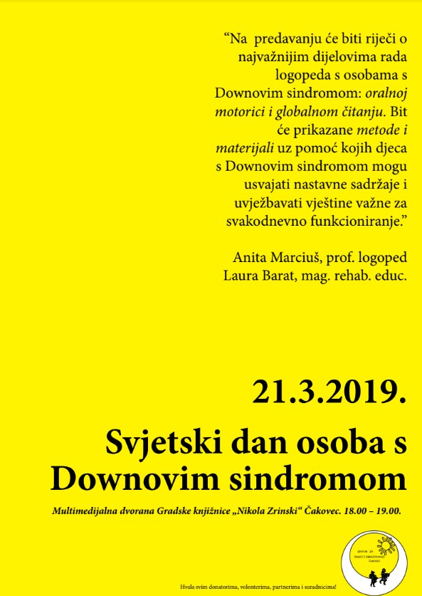 Na predavanju će biti riječi o najvažnijim dijelovima rada logopeda s osobama s Downovim sindromom: oralnoj motorici i globalnom čitanju. Bit će prikazane metode i