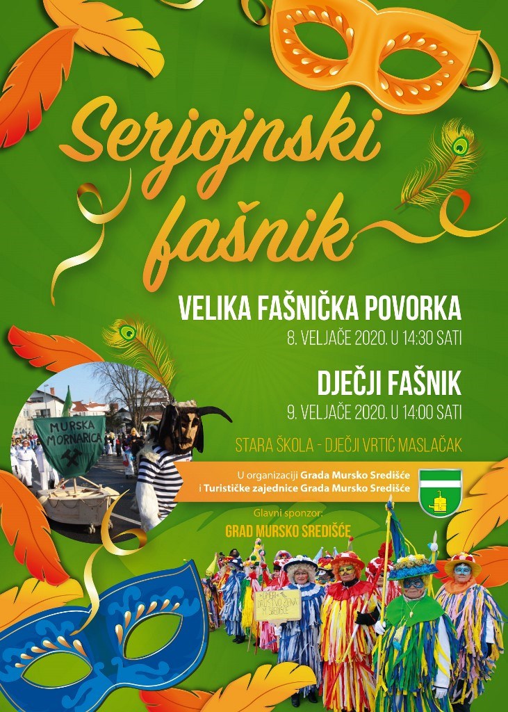 Turistička zajednica Grada Mursko Središće i Grad Mursko Središće sa velikim zadovoljstvom Vas pozivaju na tradicionalni „Serjojnski fašnik 2020.“ koji će se održati u subotu 08.02.2020. godine s početkom u 14,30 sati u Murskom Središću. Fašnička povorka i ovoga puta oživjet će pokladne običaje, pjesmu, ples i ludost kroz ulice našega grada.
