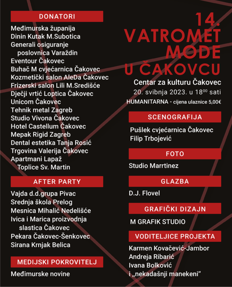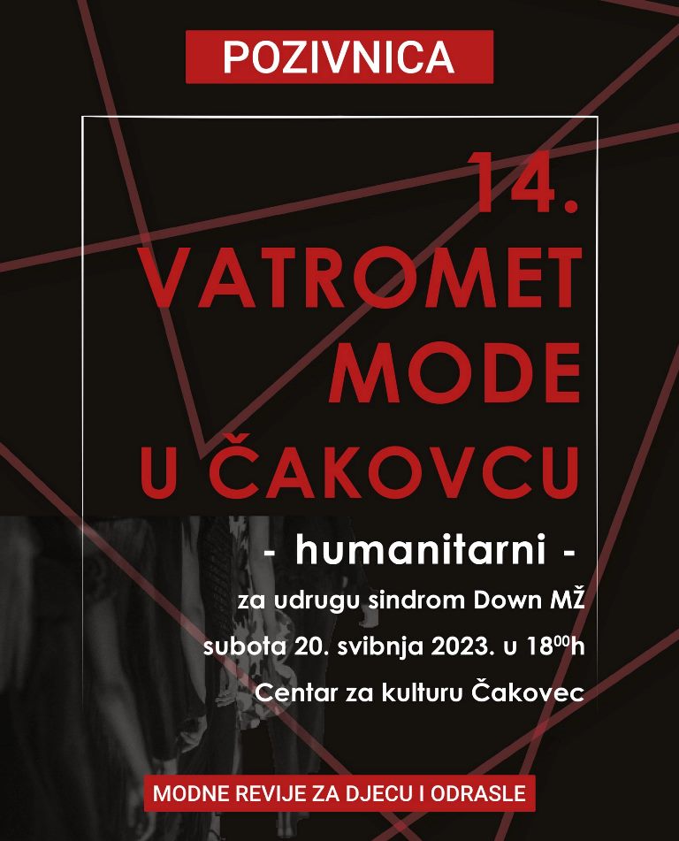 14. Vatromet mode je humanitarnog karaktera, a sav prihod od ulaznica donirat će se Udruzi za sindrom Down Međimurske županije. Ulaznice su u prodaji i iznose 5 eura, a dostupne su na blagajni Centra za kulturu Čakovec u redovno radno vrijeme blagajne ili mrežno na poveznici: ulaznice.czk-cakovec.hr.