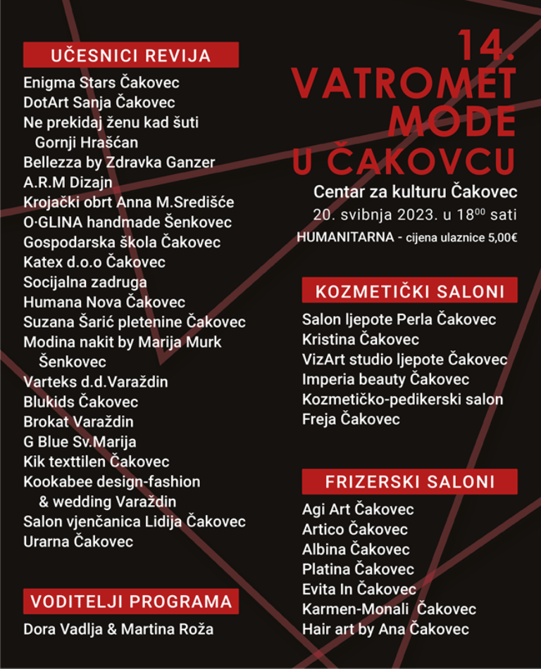 Nakon višegodišnje pauze vraća se najveći modni događaj na našem prostoru, poznat iz vremena žive čakovečke modne scene – Vatromet mode. Brojne revije modnih kuća i mladih dizajnera uvijek su do zadnjeg mjesta ispunili Centar za kulturu Čakovec, a tako će biti i ove subote, 20. svibnja s početkom u 18 sati.