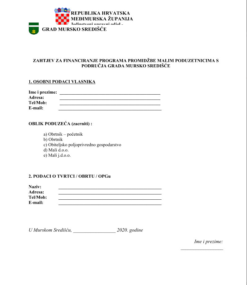 ZAHTJEV KOJI MOŽETE ISPRINTATI, POPUNITI I DOSTAVITI U GRADSKU UPRAVU ILI POSLATI E MAILOM:
