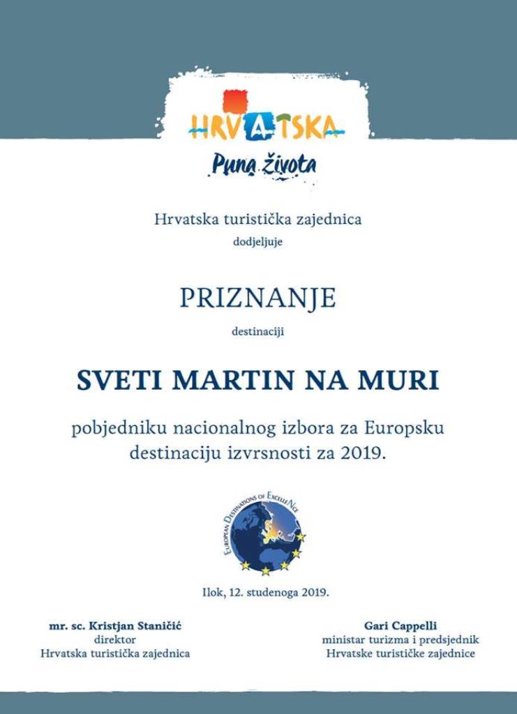 Međimurje je jedina regija u Europi kojoj je prestižna oznaka turističke izvrsnosti EDEN dodijeljena po treći put. Silno važna vijest stigla je u Međimurje iz Iloka gdje se jučer održavala završnica izbora najbolje turističke wellness destinacije u Hrvatskoj. U konkurenciji za ovogodišnji EDEN bili su Daruvar, Stubičke toplice, Krapinske toplice, Tuhelj i Sveti Martin na Muri. U Hrvatskoj turističkoj zajednici i Ministarstvu turizma su u programu izbora nacionalnog pobjednika Europske destinacije izvrsnosti (EDEN) za 2019. – tu zadali temu wellness i zdravstveni turizam. Voditelj Turističke zajednice Međimurske županije Rudi Grula je u najkraćim naglascima predstavio pobjedničke wellness i well-being sadržaje Toplica Sveti Martin. Isticanjem slogana „Svijet zdravih užitaka“ podsjetio je na brojne prirodne resurse, etnografske sadržaje, etnografske centre, niz manifestacija, gastro i eno ponudu, biciklističke staze ali i na prebogatu wellness ponudu po kojoj je Sveti Martin na Muri postao prepoznatljiva wellness i well-being destinacija u Hrvatskoj.