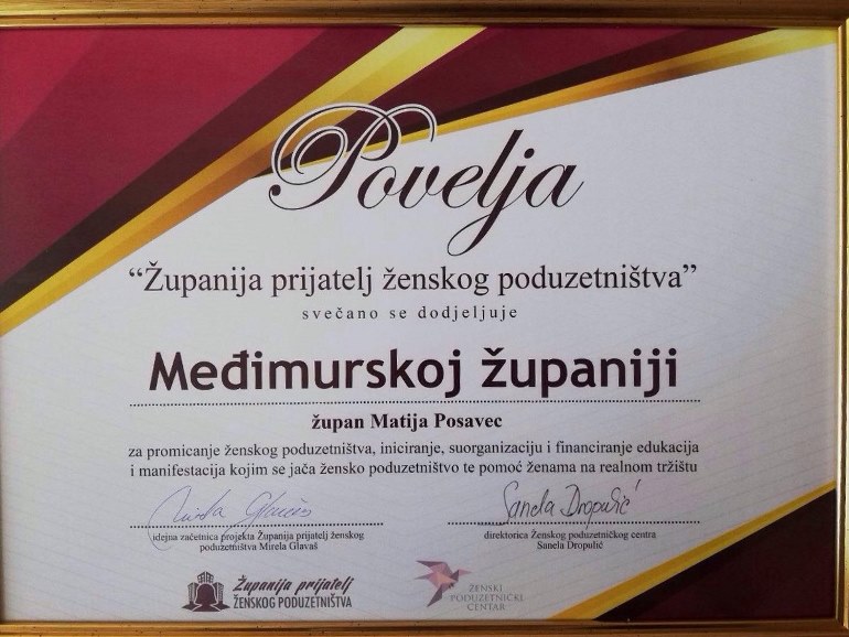Kako je navedeno u Povelji, Međimurskoj županiji upućena je zahvala za promicanje ženskog poduzetništva,iniciranje, suorganizaciju i financiranje edukacija i manifestacija kojima se jača žensko poduzetništvo. Zamjenica župana Sandra Herman istaknula je kako u Međimurju ima puno uspješnih poduzetničkih primjera te naglasila kako se unazad nekoliko godina u organizaciji Povjerenstva za ravnopravnost spolova Međimurske županije uspješno održava i “Sajam ženskog poduzetništva”. Najavila je i novi projekt, konferenciju „Novo lice (ženskog) poduzetništva“ u organizaciji obrta za edukaciju i savjetovanje Konekta koja će biti održana 11. travnja 2019. u Čakovcu, uz sudjelovanje velikog broja žena koje posluju na području sjevera Hrvatske. “Ova Povelja rezultat je kontinuiranog rada i ulaganja u sve sektore gospodarstva Međimurske županije. Posebno smo ponosni na iznimno uspješne i svjetski poznate međimurske poduzetnice. Međimurska županija i nadalje će podupirati ne samo sadašnje poduzetnice već i sve žene koje se odvaže ući u zahtjevan svijet poduzetništva.” – izjavila je zamjenica župana Sandra Herman.