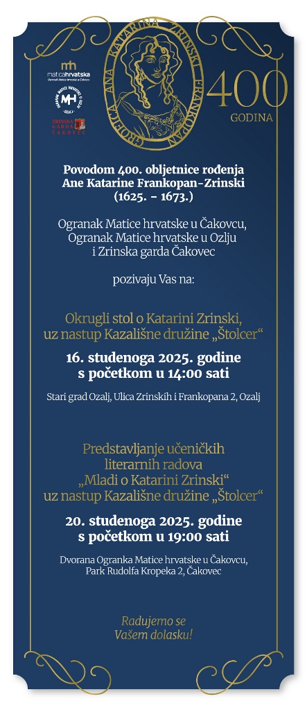 Povodom 400. obljetnice rođenja slavne hrvatske plemkinje i ranonovovjekovne književnice Katarine Zrinski, Ogranak Matice hrvatske u Čakovcu u suradnji s Ogrankom Matice hrvatske u Ozlju i Zrinskom gardom Čakovec, obilježit će ovaj važan jubilej u Ozlju i Čakovcu.