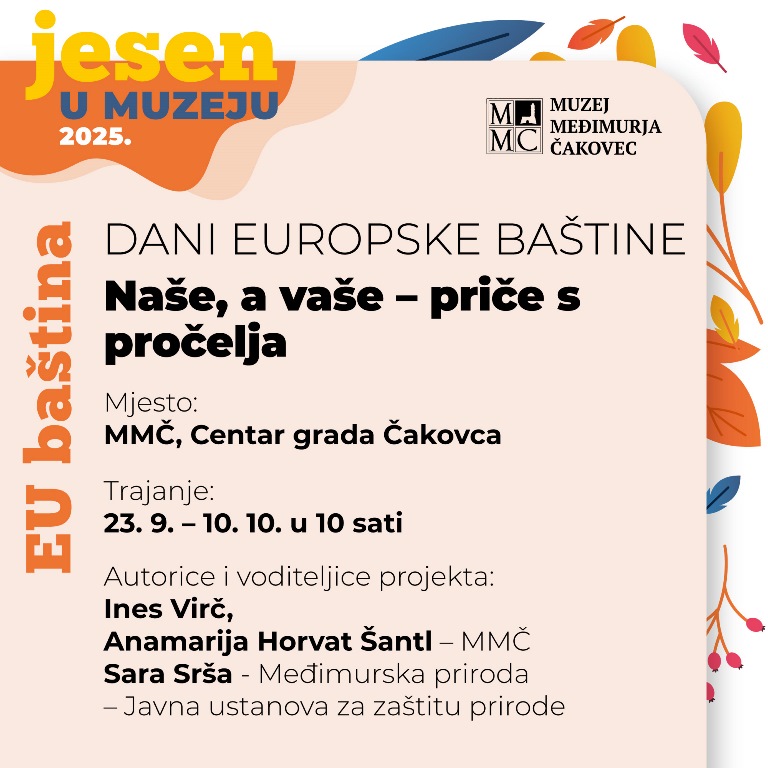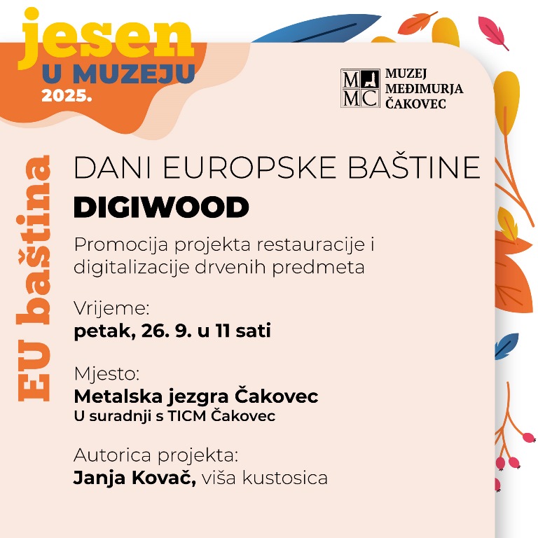 Jesenski program obogaćuju i Dani europske baštine (23. 9. – 10. 10. 2025.), manifestacija koja donosi šetnje gradom, radionice i izložbu „Naše, a vaše – priče s pročelja“. Program kreiraju muzejske djelatnice Ines Virč i Anamarija Horvat Šantl uz suradnji sa Sarom Srša iz Međimurske prirode. U okviru istog programa, 26. rujna u Metalskoj jezgri bit će predstavljeni rezultati projekta „DIGIWOOD“ – digitalizacije i restauracije drvenih predmeta pod vodstvom više kustosice Janje Kovač.