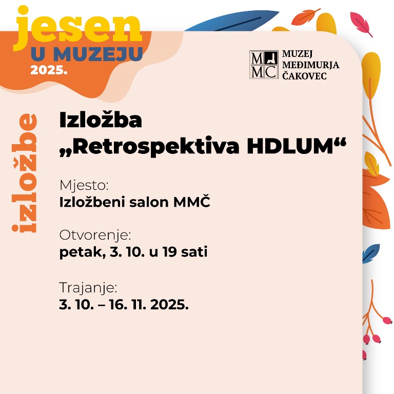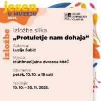 Listopad će otvoriti dugo očekivana „Retrospektiva HDLUM“ – izložba koja donosi presjek recentnog stvaralaštva akademskih umjetnika iz Međimurja. Otvorenje je 3. listopada 2025. u 19 sati u Izložbenom salonu MMČ-a. Samo tjedan dana kasnije, 10. listopada u 19 sati, u Multimedijalnoj dvorani otvara se i izložba „Protuletje nam dohaja“ mlade autorice Lucije Šubić.