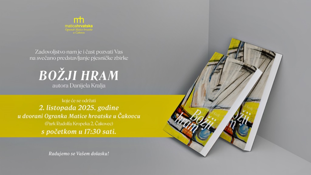U četvrtak, 2. listopada, Ogranak Matice hrvatske u Čakovcu u dvorani uz svoje prostorije na adresi Park Rudolfa Kropeka 2, Čakovec upriličit će svečano predstavljanje nove pjesničke zbirke Danijela Kralja „Božji hram“, 131. djela objavljenog u svojoj nakladi.
