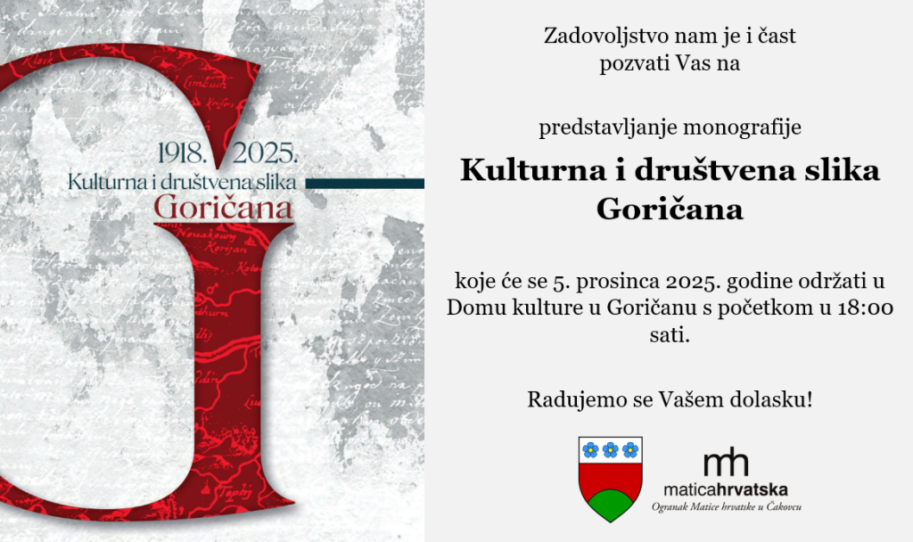 U petak, 5. prosinca, Općina Goričan i Ogranak Matice hrvatske u Čakovcu upriličit će svečanost predstavljanja nove monografije „Kulturna i društvena slika Goričana“. Predstavljanje će se održati u Domu kulture u Goričanu s početkom u 18:00 sati.