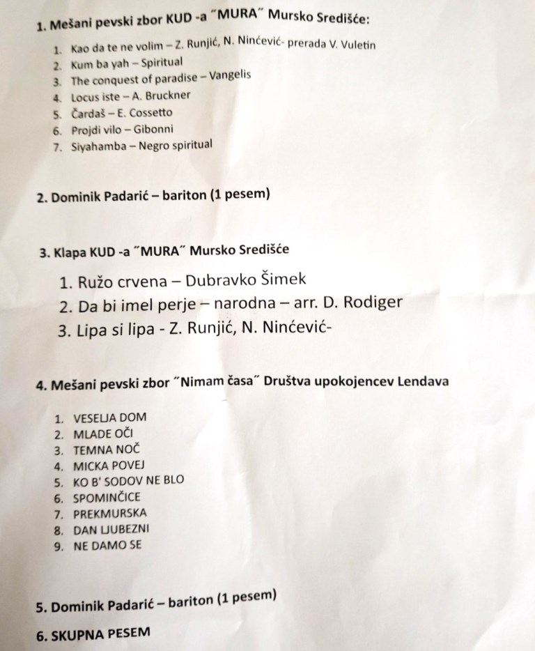 Domaćini, Mešani pevski zbor “Nimam časa” DU Lendava, iznenadili su rasponom, temperamentom i odabirom pjesama, od kojih su se posebno istaknule Mlade oči, Dan Ljubezni i energična Nedamo se.