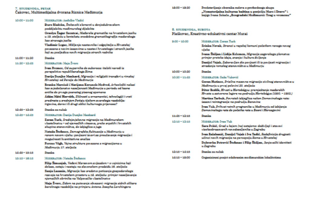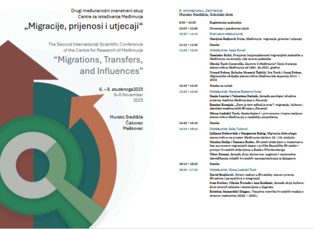 Skup će započeti u četvrtak, 6. studenoga, u Sokolskom domu u Murskom Središću, gdje će nakon svečanog otvaranja uslijediti niz izlaganja posvećenih suvremenim i povijesnim migracijskim procesima u Međimurju i širem hrvatskom kontekstu. Plenarno predavanje održat će prof. dr. sc. Marijeta Rajković Iveta s Filozofskoga fakulteta u Zagrebu na temu „Međimurje: migracije, granice i utjecaji“, kojim će se otvoriti rasprava o slojevitim oblicima mobilnosti na ovome prostoru. Izlaganja u nastavku obuhvatit će demografske i društvene izazove Međimurja, kulturne i identitetske aspekte iseljavanja te povijesne i suvremene migracijske procese – od „gasterbajtera“ i dijaspore do novih oblika mobilnosti i integracije na području cijele Hrvatske.