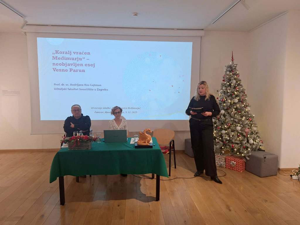 U petak, 5. prosinca u Multimedijalnoj dvorani Riznice Međimurja otvorena je izložba „VESNA PARUN: KORALJ VRAĆEN MEĐIMURJU“. To je gostujuća izložba Muzeja Prigorja koji je 2019. godine otkupio manju zbirku radova, predmeta, knjiga i dokumenata iz ostavštine Vesne Parun. Autorice izložbe su dr.sc. Žarka Vujić, redovita profesorica FFZG na Odsjeku za informacijske i komunikacijske znanosti i ravnateljica Muzeja Prigorja Morena Želja Želle.