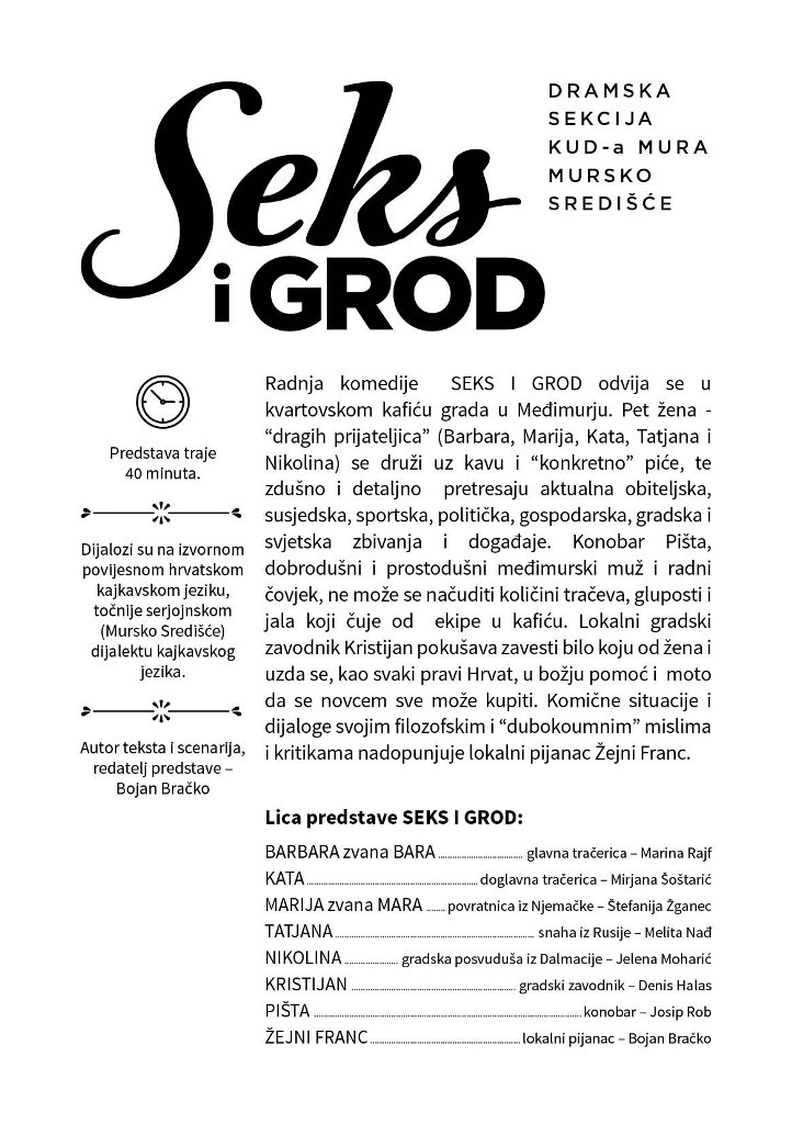 Nakon velikog uspjeha predstave „Na smrtni postelji“ dramska sekcija KUD-a Mura iz Murskog Središća pripremila je novu komediju autora Bojana Bračka „Seks i grod“.