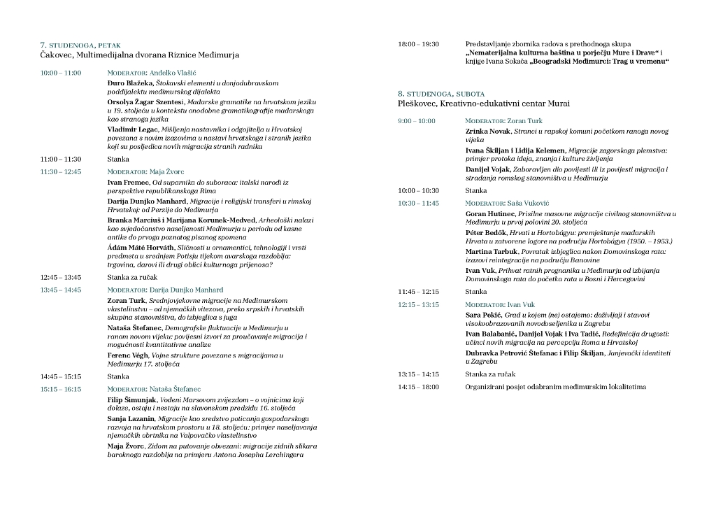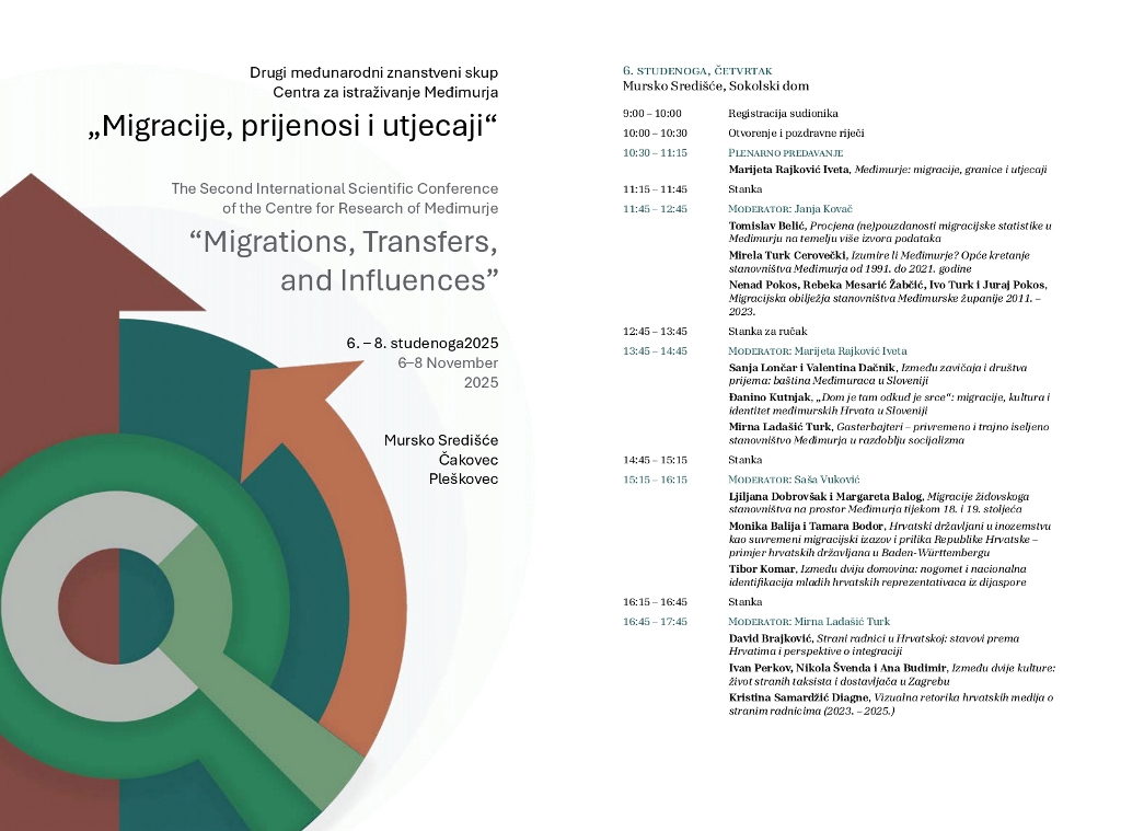 Znanstveni dio skupa plenarnim predavanjem otvorit će dr. sc. Marijeta Rajković Iveta, govoreći o migracijama, granicama i utjecajima na primjeru Međimurja kao granične regije. U nastavku dana uslijedit će četiri veće tematske sekcije, pokrivajući niz zanimljivih tema – od migracijskih i demografskih kretanja u suvremenoj Međimurskoj županiji, preko boravka hrvatskog stanovništva u stranim zemljama nekada i danas, pa sve do trenutno sve relevantnijih tema dolaska na rad u Republiku Hrvatsku i integracije strane radne snage s drugih kontinenata.