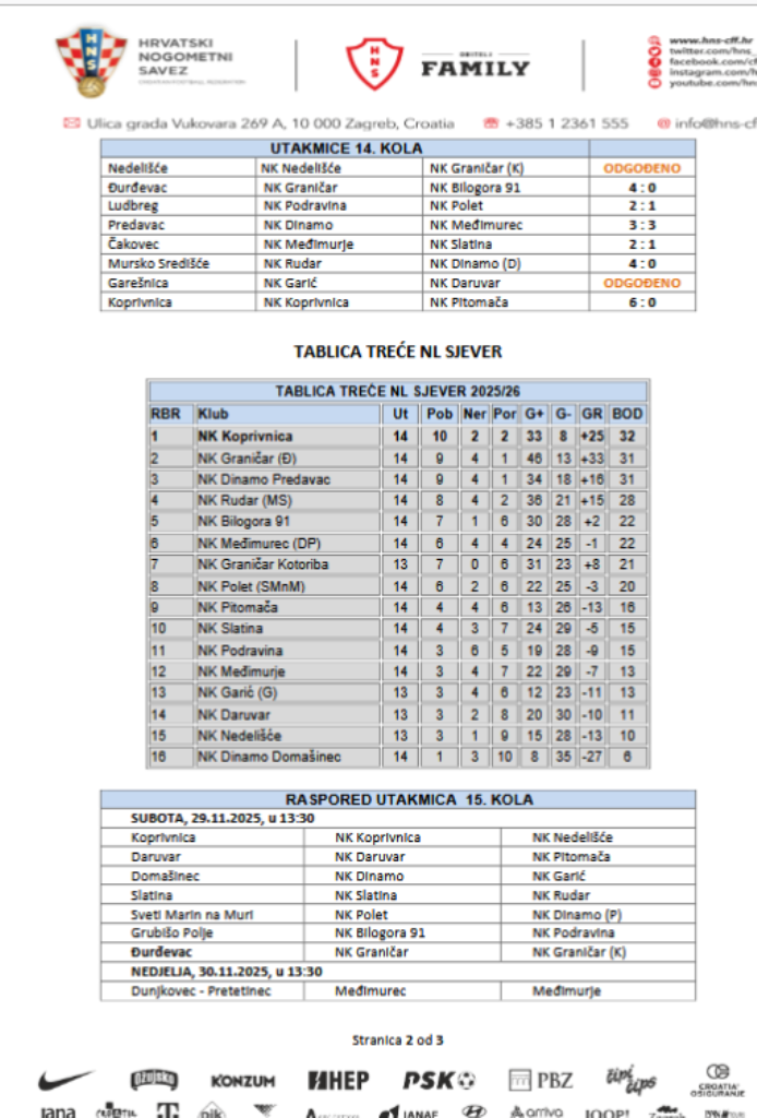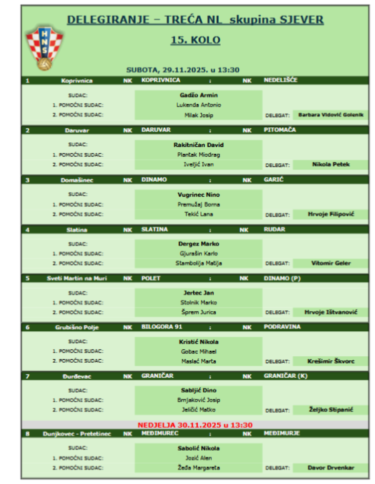 Nakon odigranog snježnog 14. kola i uvjerljive pobjede nad Dinamom iz Domašinca, Rudara u posljednjem 15. kolu 3.NL Sjever očekuje dosta teško gostovanje u u dosta udaljenoj Slatini protiv istoimene ekipe. Utakmica se igra u subotu 29. studenoga 2025. U 13,30 sati.