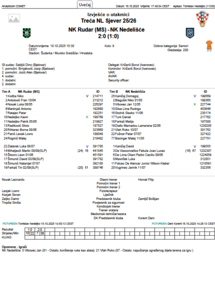 U 9. kolu 3. NL Sjever Rudar je na svojoj Šuderki dočekao ekipu Nedelišća i rutinski došao do pobjede od 2:0.