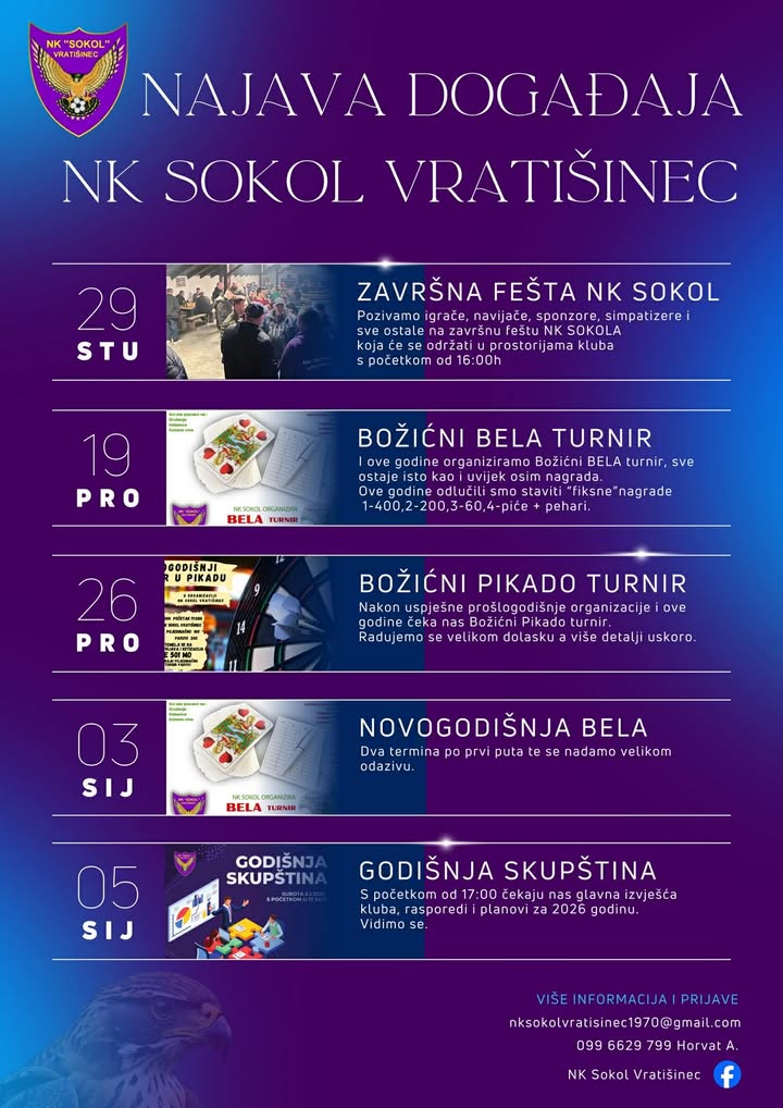 Nogometni klub Sokol Vratišinec objavio je raspored zimskih događanja koji obuhvaća fešte, popularne kartaške i pikado turnire te završnu godišnju skupštinu. Klub tako i ove godine nastavlja tradiciju okupljanja članova, navijača i simpatizera kroz niz druženja tijekom prosinca i siječnja.