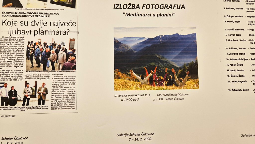 Hrvatsko planinarsko društvo Međimurje Čakovec s ponosom je u petak 14. studenog u izložbenom prostoru zgrade Scheier u Čakovcu predstavilo fotografske “štiklece” svog tridesetgodišnjeg djelovanja. Izložbeni postav čine fotografije planinarskih izleta, događanja, druženja, edukacije velikih i malih planinara, memorabilije i novinski isječci. Sve su to tragovi i uspomene iskrene strasti prema planinama, društvu i prirodi, koju ovo agilno društvo njeguje već punih trideset godina.