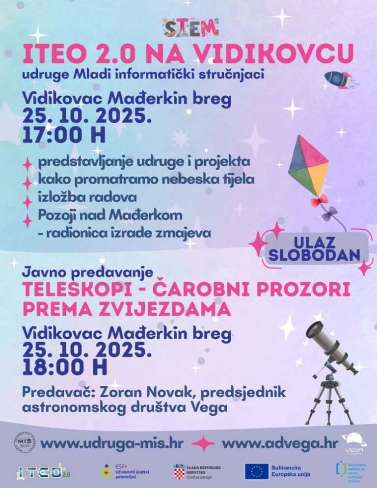 Na Mađerkinom bregu organiziramo i javno predavanje TELESKOPI – ČAROBNI PROZORI PREMA ZVIJEZDAMA s početkom u 18 sati.