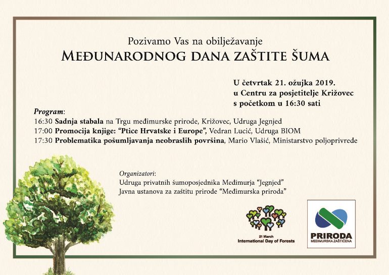 Pridružite nam se u obilježavanju Međunarodnog dana zaštite šuma, 21. ožujka 2019. godine u Križovcu. Očekujemo Vas u 16:30 sati na Trgu međimurske prirode s malom akcijom sadnje stabala (Udruga Jegnjed), a kasnije na predstavljanju priručnika “Ptice Hrvatske i Europe” (Vedran Lucić, BIOM) i predavanju o problematici pošumljavanja neobraslih površina(Mario Vlašić, Ministarstvo poljoprivrede).