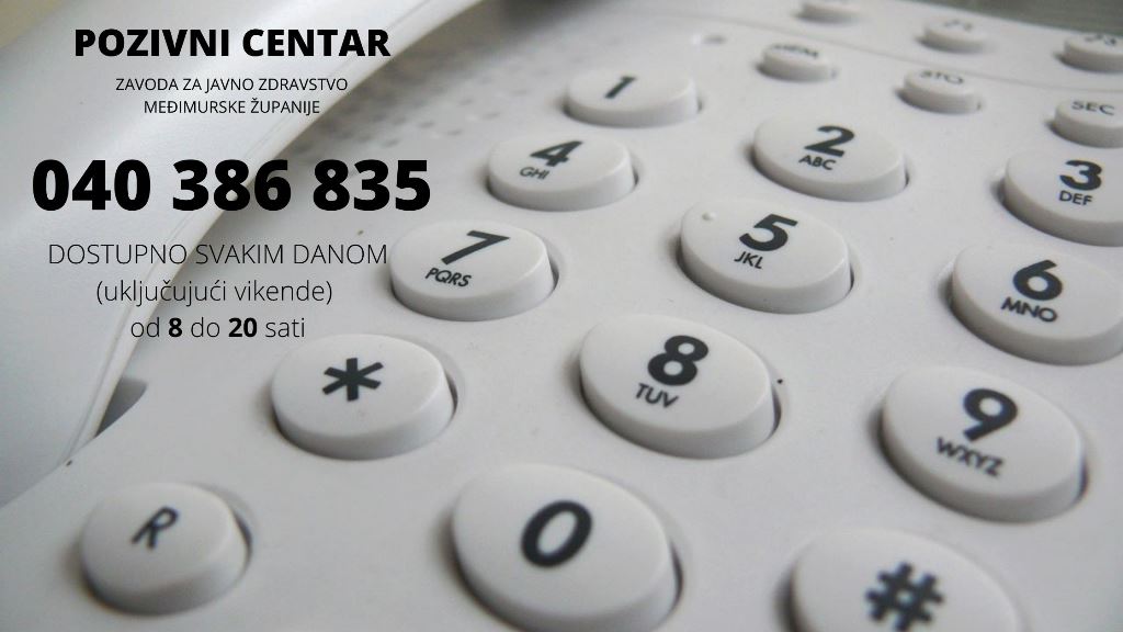 Najava testiranja može se izvršiti na broju 040/386-841 ili na e-mail adresi [email protected]. Detaljnije upute se nalaze na web stranici Zavoda za javno zdravstvo Međimurske županije https://www.zzjz-ck.hr/. Pozivni centar je na broju 040 386 835, svakodnevno od 8.00 – 20.00 sati, uključivo subotom i nedjeljom. Pozivni centar primarne zdravstvene zaštite je na broju 372-372.