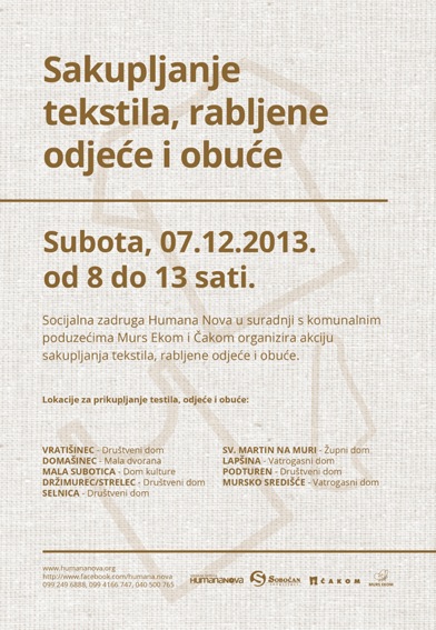 MURS-EKOM i ČAKOM organizira sakupljanje tekstila, tekstilne odjeće i obuće prema kalendaru sakupljanja. Sakupljanje će se odvijati u subotu 07. prosinca, u vremenu od 8 do 13 sati na slijedećim lokacijama