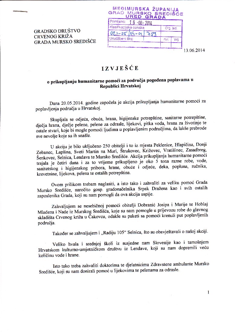 Objavljeno: 17. lipnja 2014 Autor: IZVJEŠĆE GRADSKOG CRVENOG KRIŽA O PRIKUPLJENOJ POMOĆI ZA POPLAVLJENA PODRUČJA Podijeli: IZVJEŠĆE Podijeli: