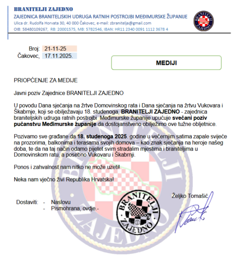 U povodu Dana sjećanja na žrtve Domovinskog rata i Dana sjećanja na žrtvu Vukovara i Škabrnje, koji se obilježavaju 18. studenoga, BRANITELJI ZAJEDNO – zajednica braniteljskih udruga ratnih postrojbi Međimurske županije upućuje svečani poziv pučanstvu Međimurske županije da dostojanstveno obilježimo ove tužne obljetnice.