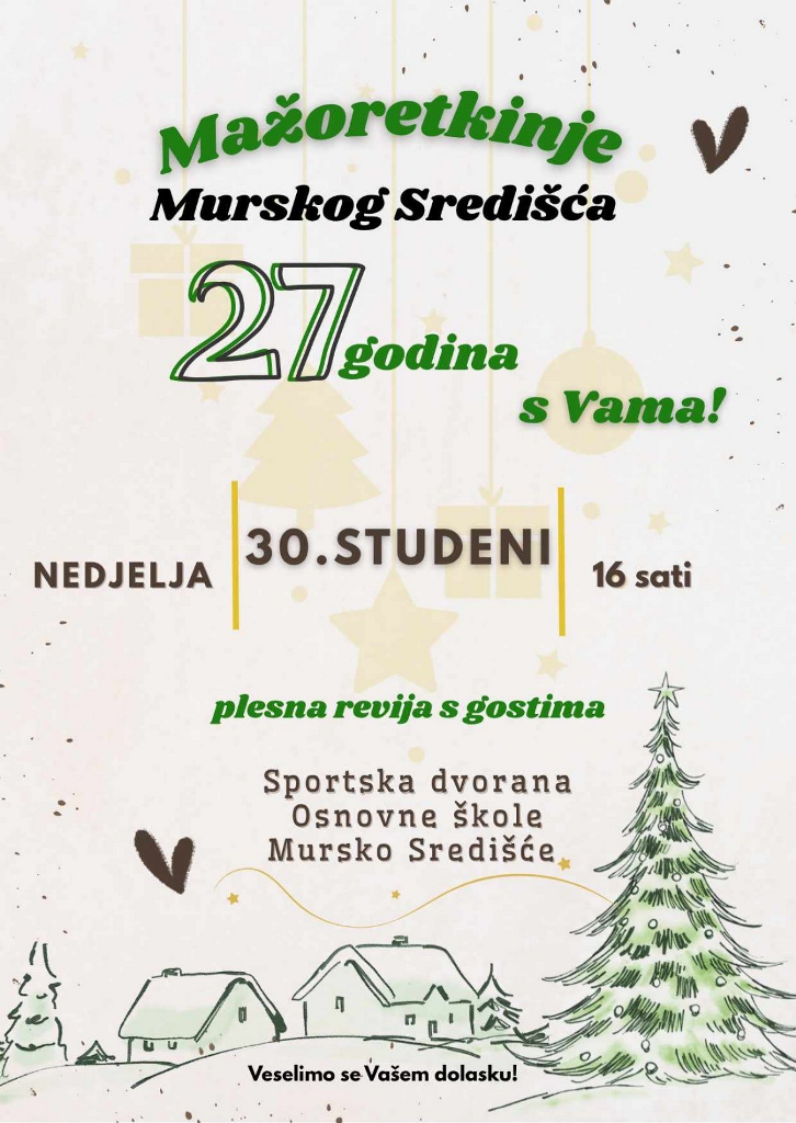 Mažoretkinje Murskog Središća ove nedjelje 30. studenog u 16,00 sati slave 27 godina djelovanja i rada s djecom i mladima. Tim povodom organiziramo plesnu reviju koja će se održati u sportskoj dvorani Osnovne škole Mursko Središće gdje publiku očekuje raznolik i bogat program ispunjen glazbom, ritmom, plesom i pozitivnom energijom. Osim svih naših skupina na reviji će svoje izvedbe pokazati i naše dugogodišnje prijateljice iz Čakovečkih mažoretkinja, mažoretkinja Goričana, Donjeg Kraljevca, Kotoribe, Koprivnice, Nedelišća, Male Subotice, Selnice te plesna skupina udruge Serjojnske mame i bebe.