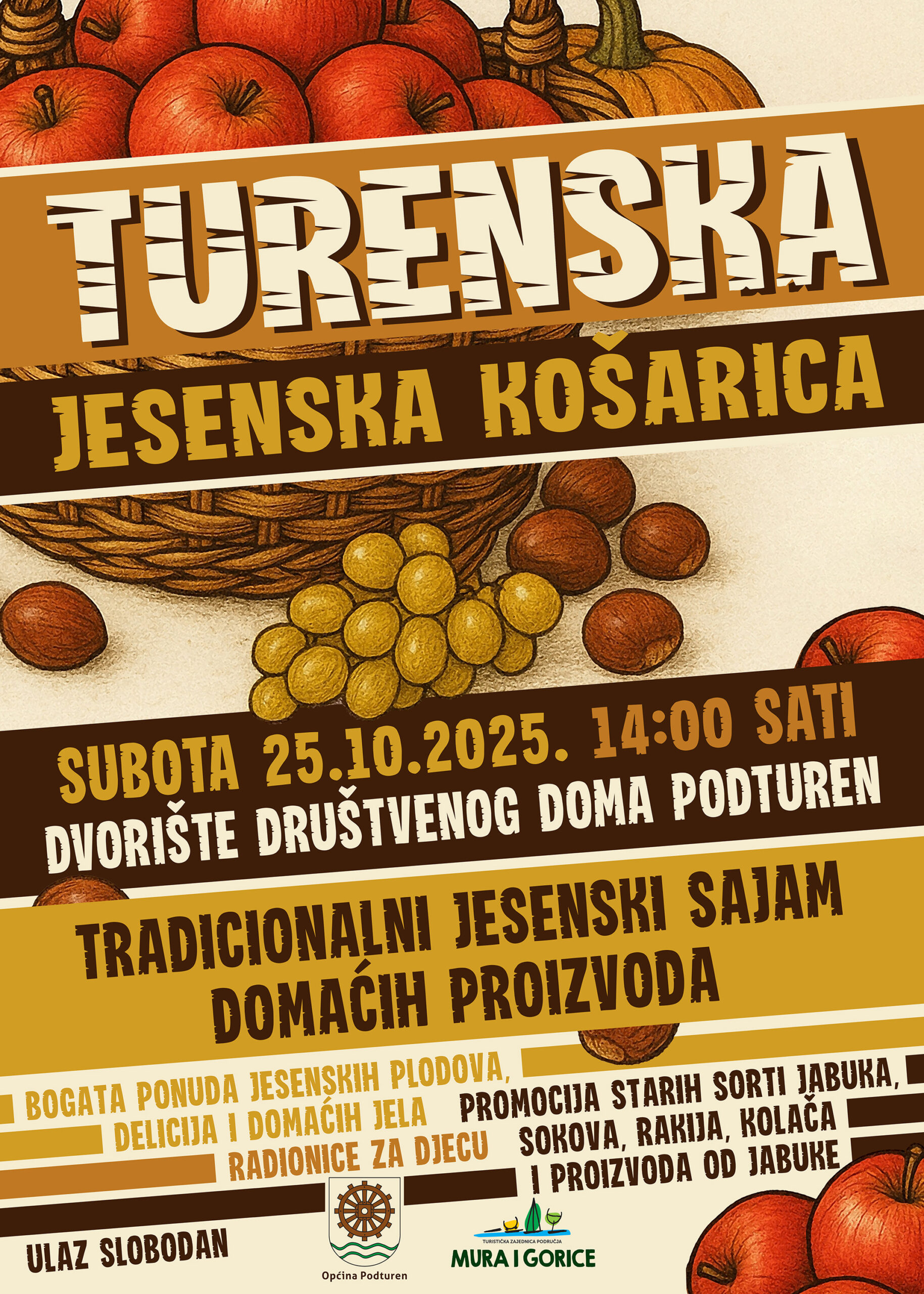 U subotu, 25. listopada 2025. godine, s početkom u 14 sati, dvorište Društvenog doma Podturen postat će središte jesenskih boja, mirisa i okusa. Održat će se prva „Turenska jesenska košarica“ posvećena plodovima jeseni i domaćim proizvodima.