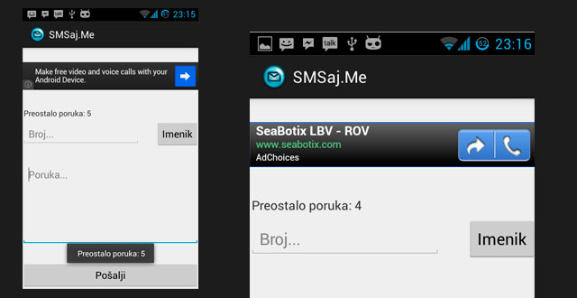Naš sugrađanin Vanja Vršić (http://vrsho.com) pokrenuo je u veljači 2013. godine SMS servis za besplatno slanje poruka (http://smsaj.me) kao jedini developer u ovom projektu. Vrlo brzo je izradio prvu probnu verziju, međutim trebalo je s vremenom još dosta toga usavršiti. Od samog početka pa do sada, puno toga se promijenilo, od izgleda web stranice pa do samog rada servisa, pa je tako i početni limit od 5 poruka vrlo brzo porastao na neograničeno. Ubrzo nakon izrade web stranice, krenuo je u izradu aplikacije za Android (https://play.google.com/store/apps/details?id=com.messaging.smsaj.me&hl=hr). Aplikacija šalje poruke u enkriptanom obliku do SMS Gateway-a, tako da ste sigurni od privatnosti sa svih strana. U aplikaciji se nalazi i imenik iz vašeg mobitela za lakši odabir primatelja. Sve poslane poruke spremaju se u vašem mobitelu pod “Poslane poruke” tako da ih imate na jednom mjestu.